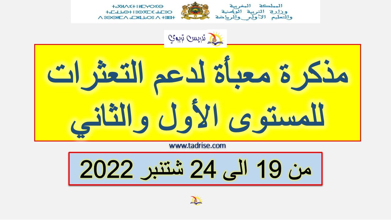 مذكرة معبأة لأسبوع دعم التعثرات الأول والثاني ابتدائي 2022 الممثلة في الصور اسفله تشمل الاسبوع الذي من 19 شتنبر الى 24 شتنبر 2022.
